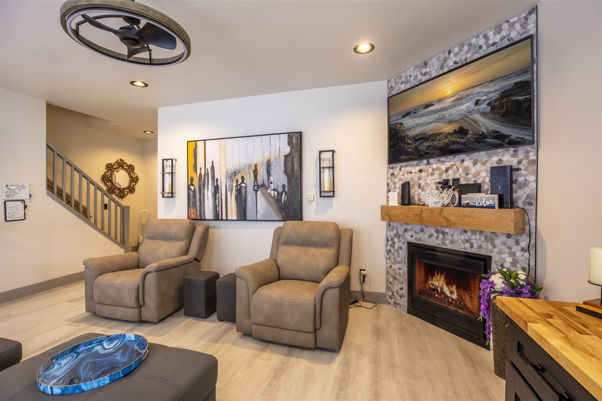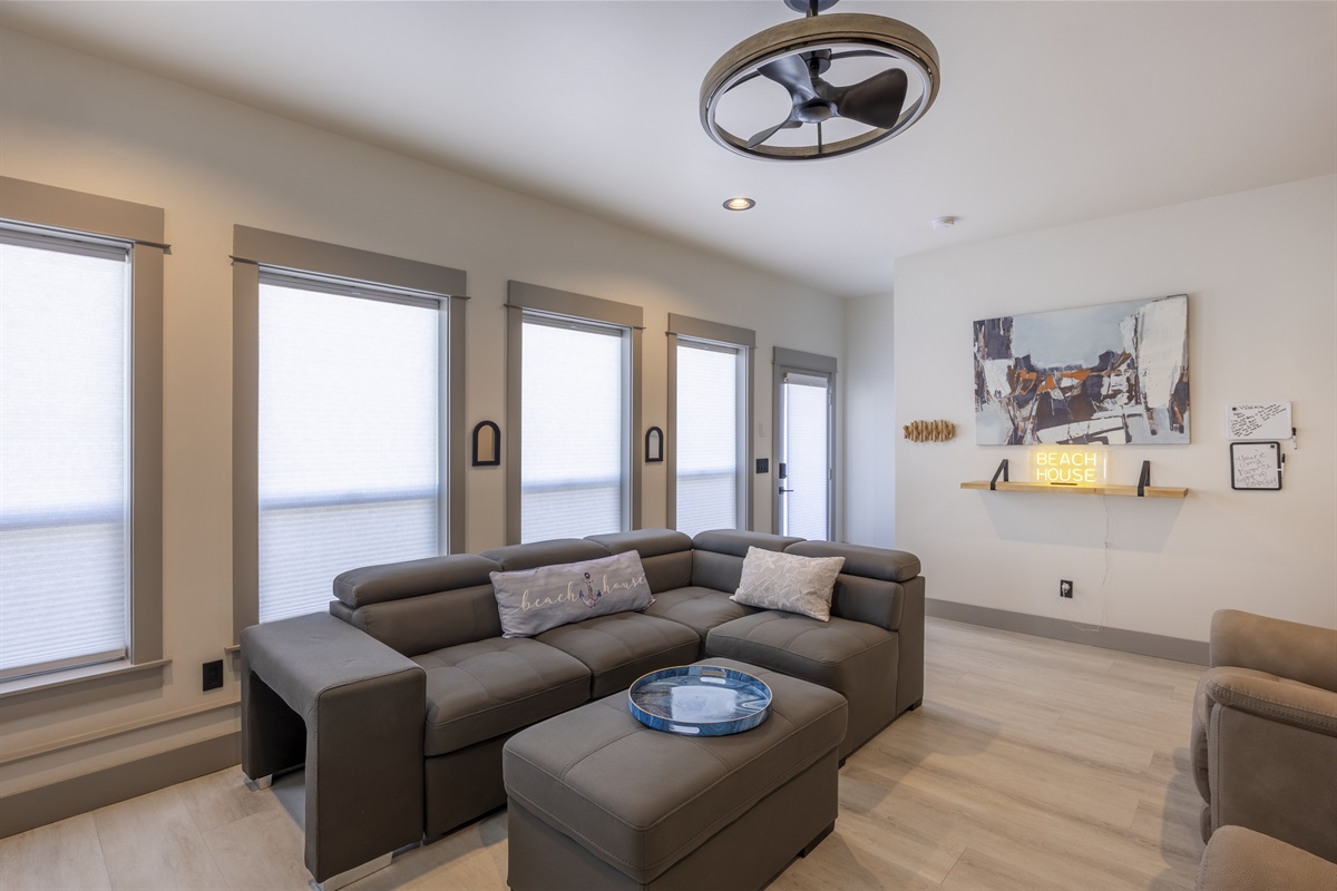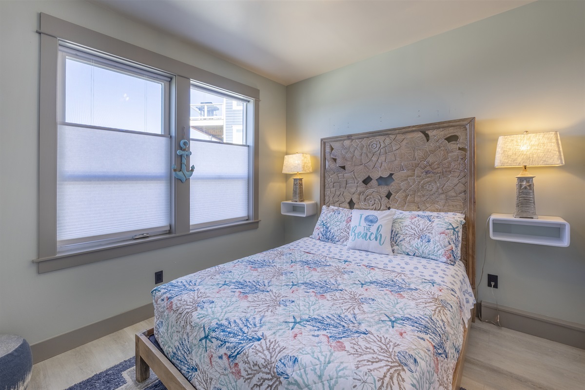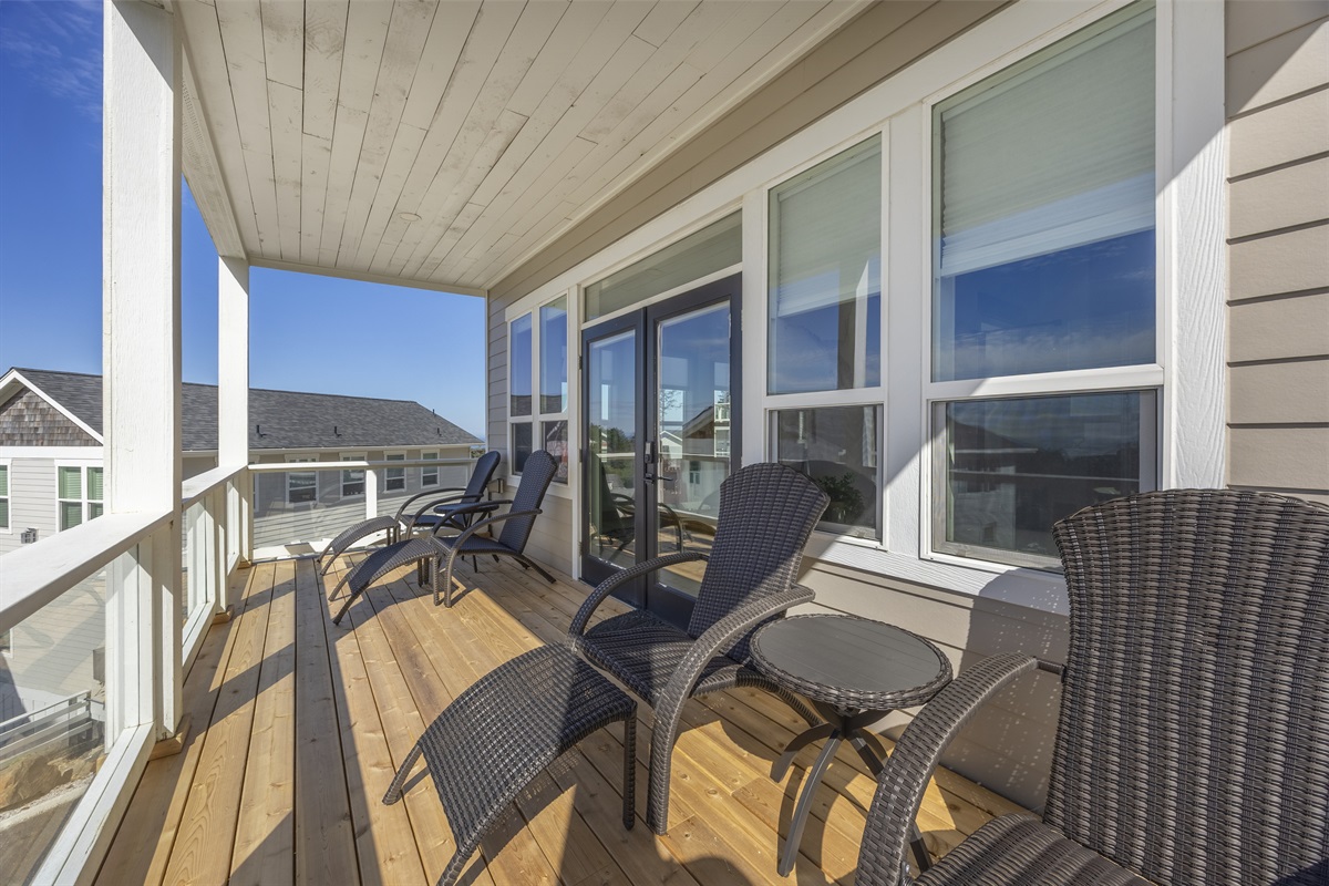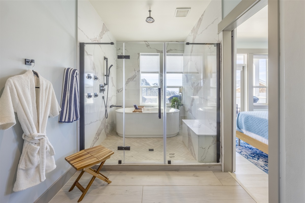 The home features three bedrooms and three and a half baths, including a spacious master suite with a king bed, a luxurious spa-style bathroom, and its own private deck with amazing ocean views. The master bath includes an open shower with multiple shower heads and a deep soaking tub, all within a serene, enclosed space designed for relaxation. Two additional cozy bedrooms each offer a queen bed, while the living areas provide additional sleeping options with a queen pull-out sofa and two twin ottoman beds, making the home ideal for families traveling together to the Oregon Coast.