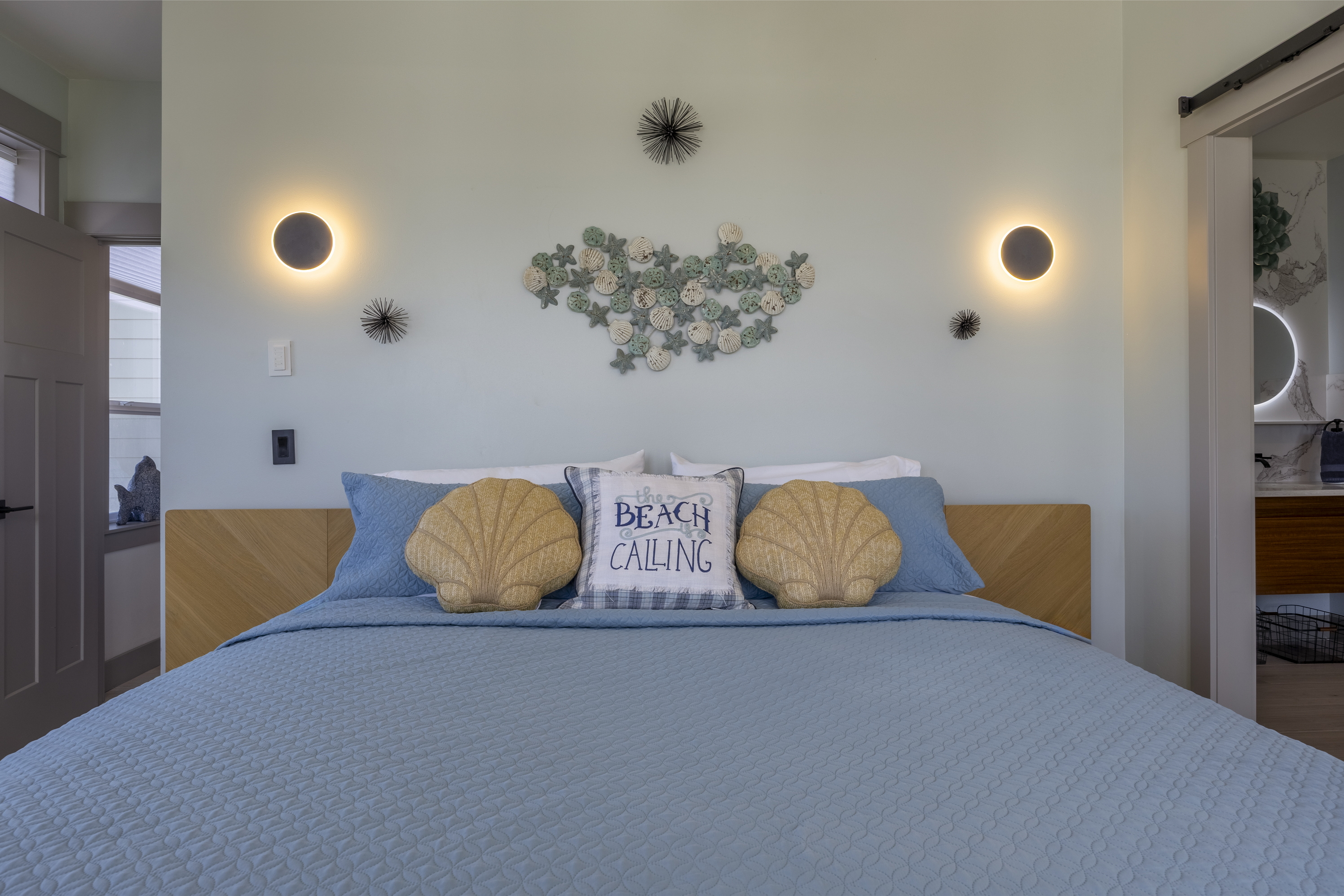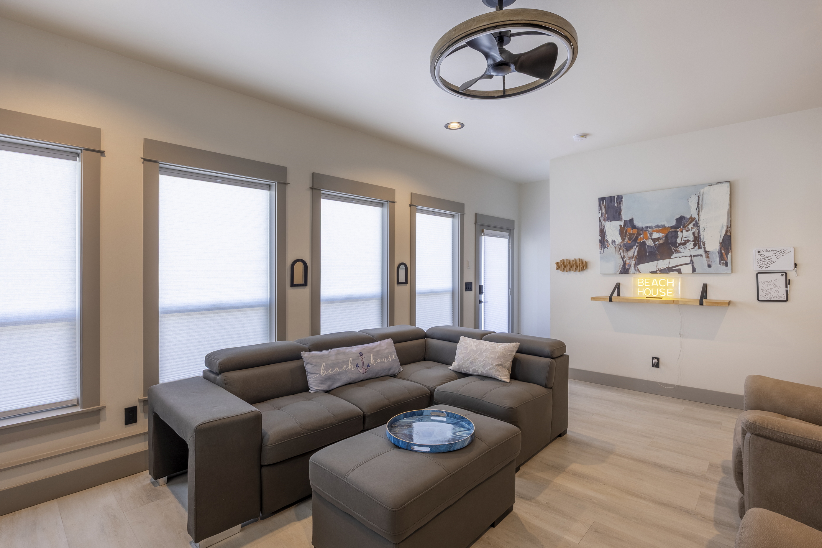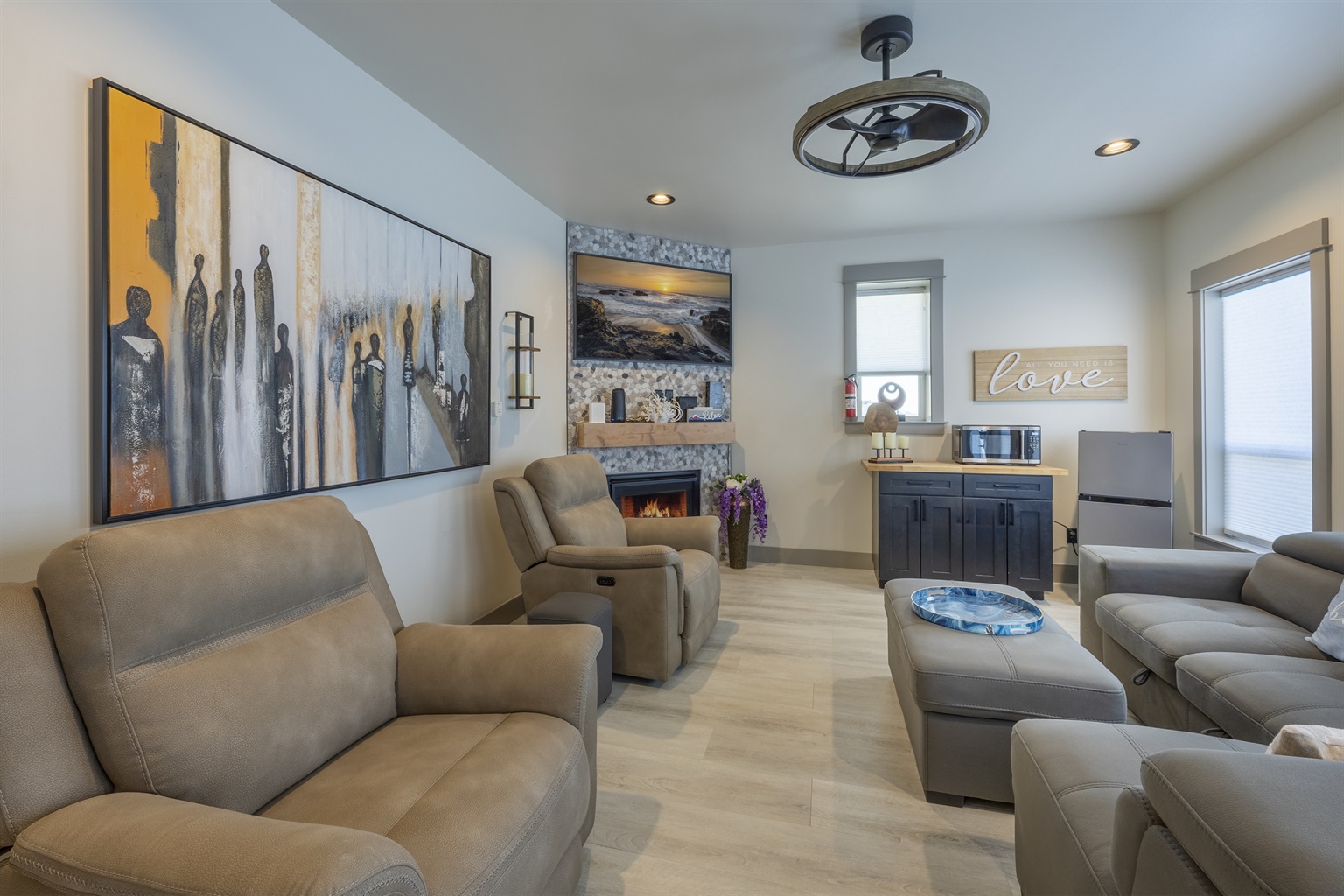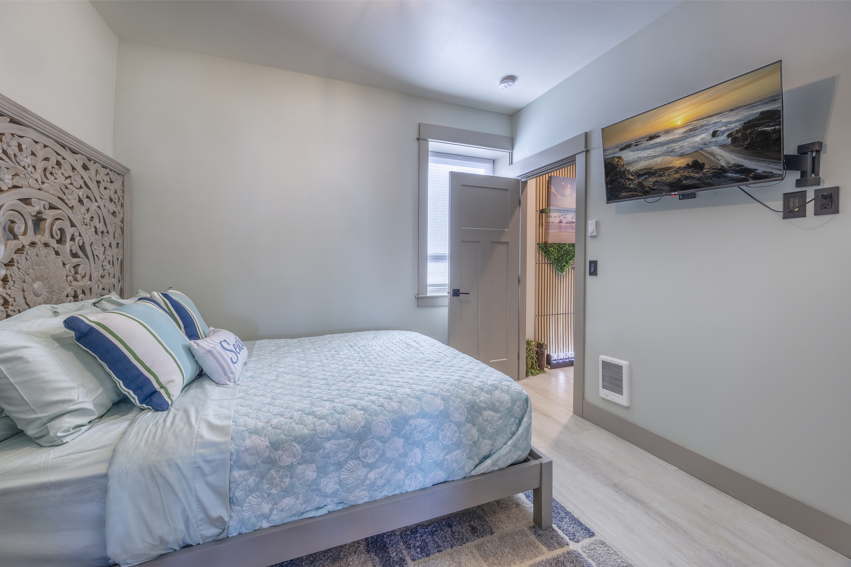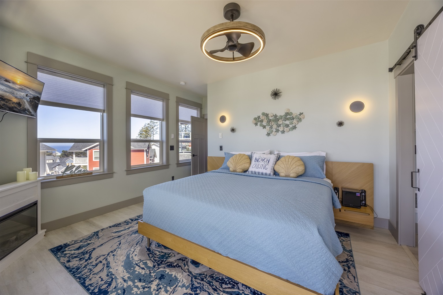 The home features three bedrooms and three and a half baths, including a spacious master suite with a king bed, a luxurious spa-style bathroom, and its own private deck with amazing ocean views. The master bath includes an open shower with multiple shower heads and a deep soaking tub, all within a serene, enclosed space designed for relaxation. Two additional cozy bedrooms each offer a queen bed, while the living areas provide additional sleeping options with a queen pull-out sofa and two twin ottoman beds, making the home ideal for families traveling together to the Oregon Coast.