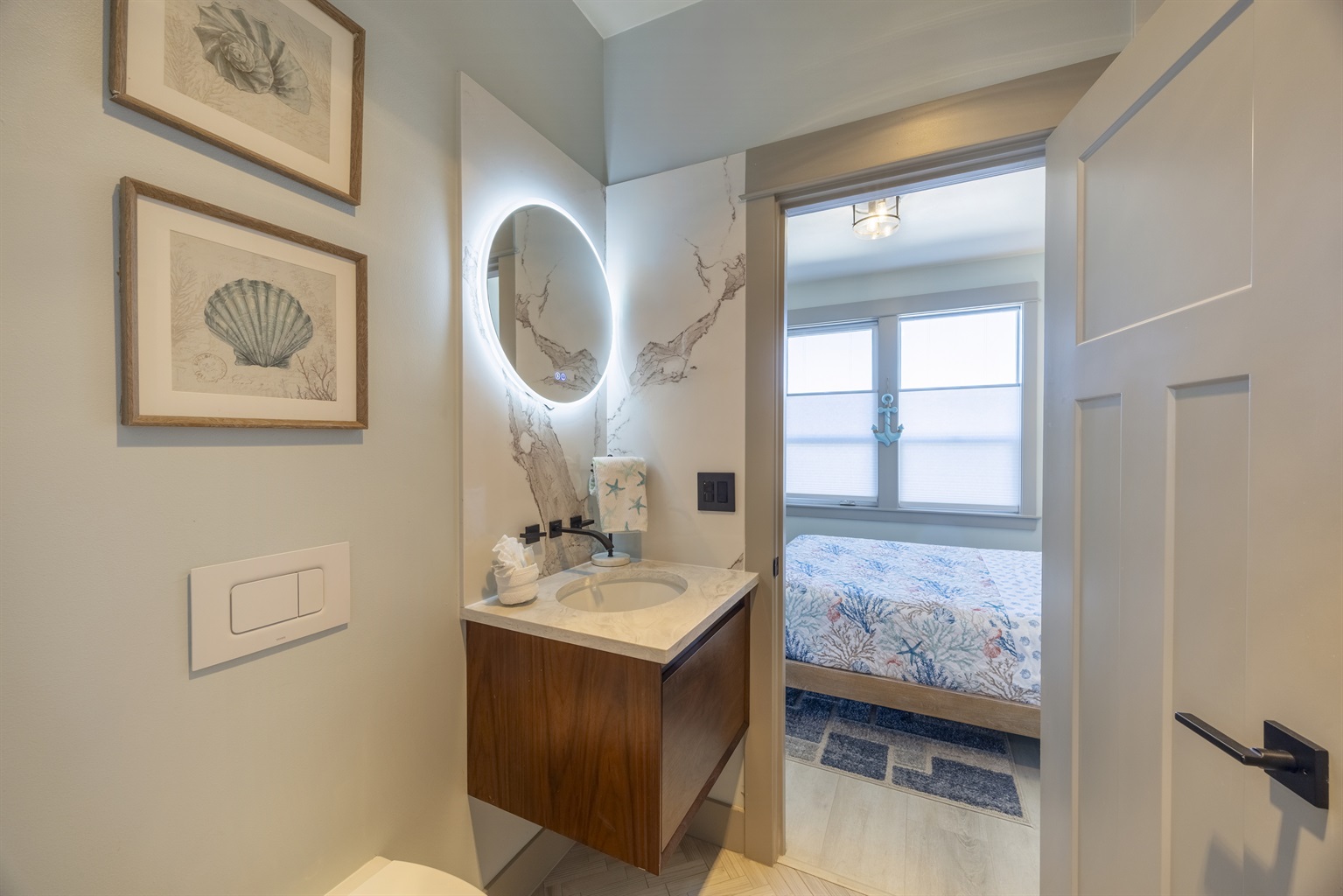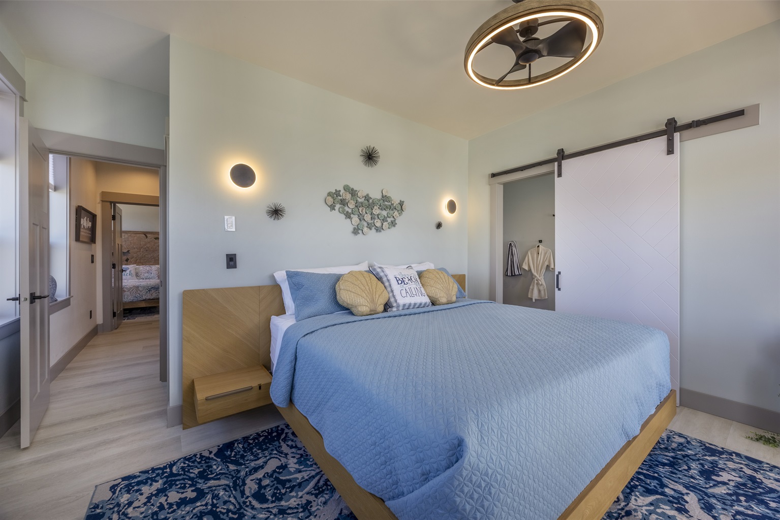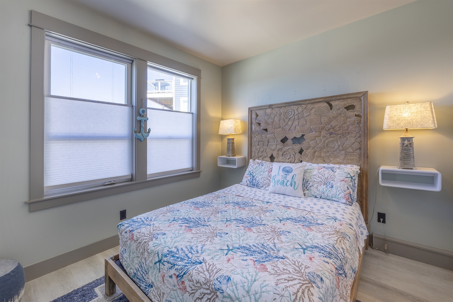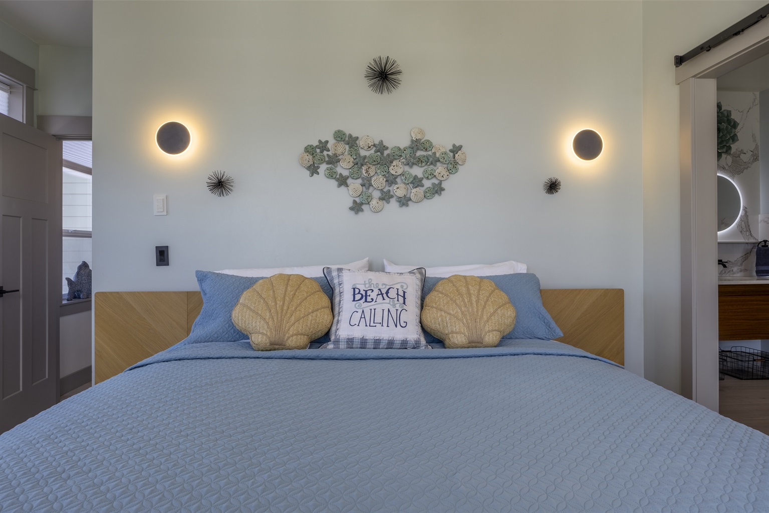 The home features three bedrooms and three and a half baths, including a spacious master suite with a king bed, a luxurious spa-style bathroom, and its own private deck with amazing ocean views. The master bath includes an open shower with multiple shower heads and a deep soaking tub, all within a serene, enclosed space designed for relaxation. Two additional cozy bedrooms each offer a queen bed, while the living areas provide additional sleeping options with a queen pull-out sofa and two twin ottoman beds, making the home ideal for families traveling together to the Oregon Coast.