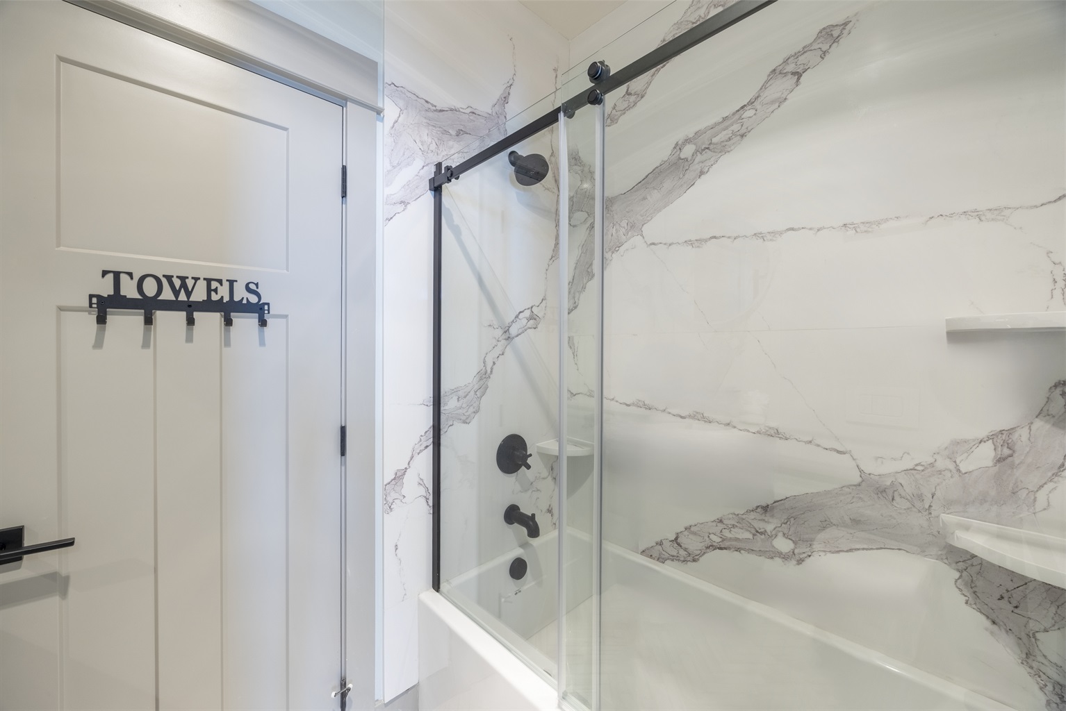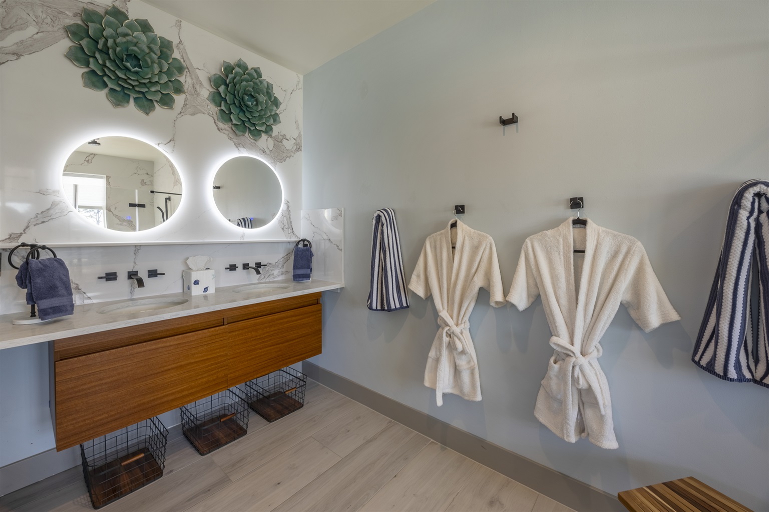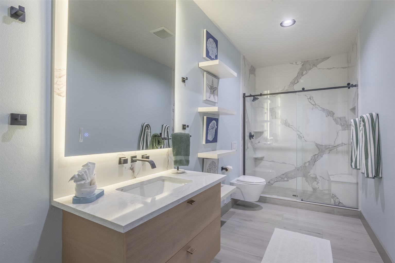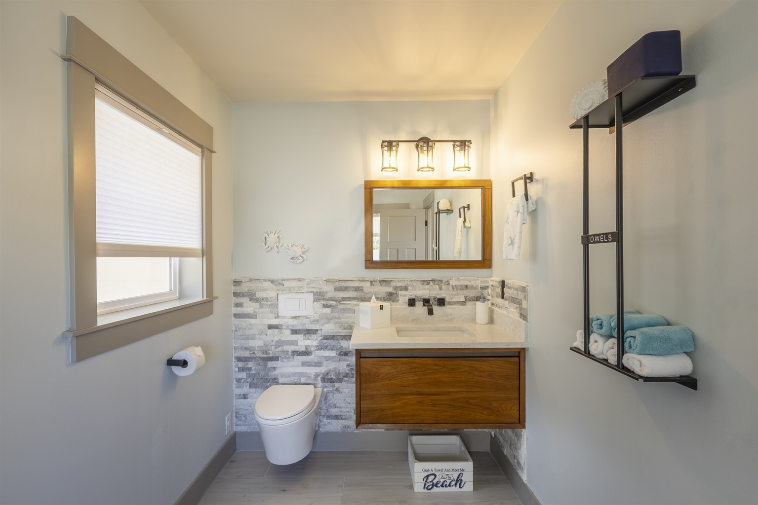 The home features three bedrooms and three and a half baths, including a spacious master suite with a king bed, a luxurious spa-style bathroom, and its own private deck with amazing ocean views. The master bath includes an open shower with multiple shower heads and a deep soaking tub, all within a serene, enclosed space designed for relaxation. Two additional cozy bedrooms each offer a queen bed, while the living areas provide additional sleeping options with a queen pull-out sofa and two twin ottoman beds, making the home ideal for families traveling together to the Oregon Coast.