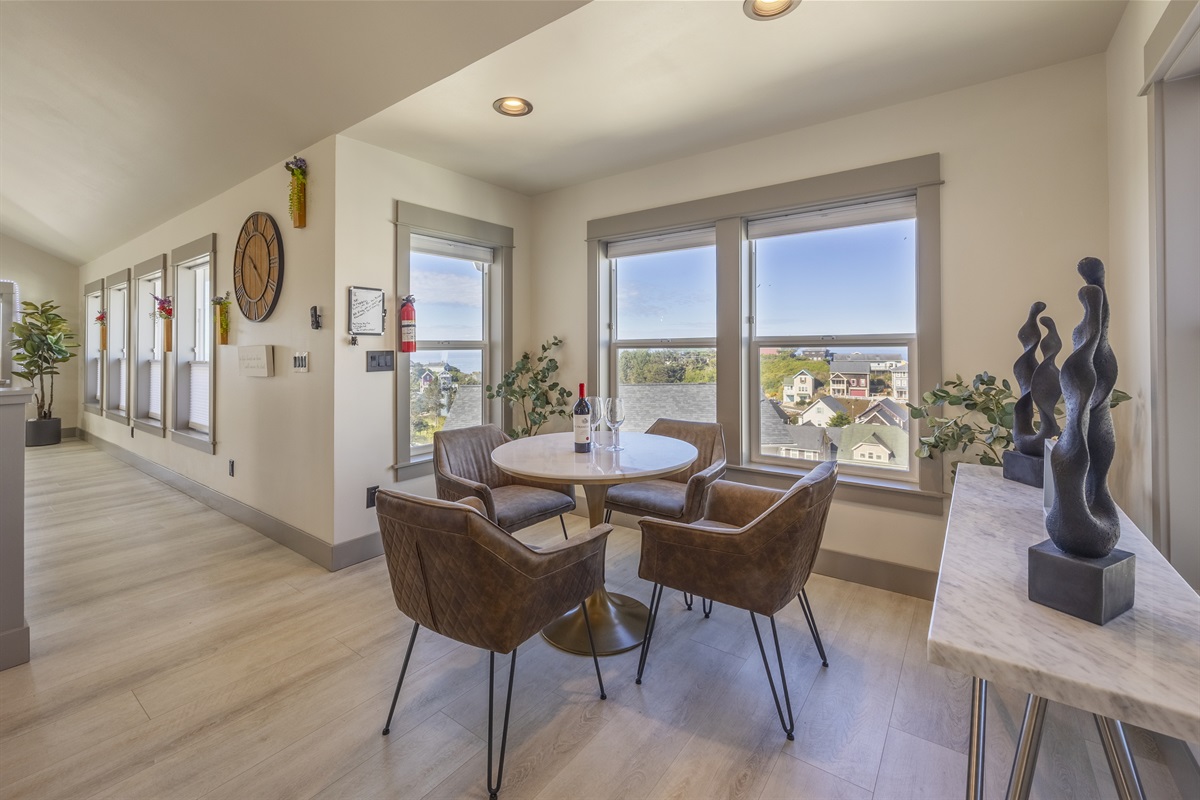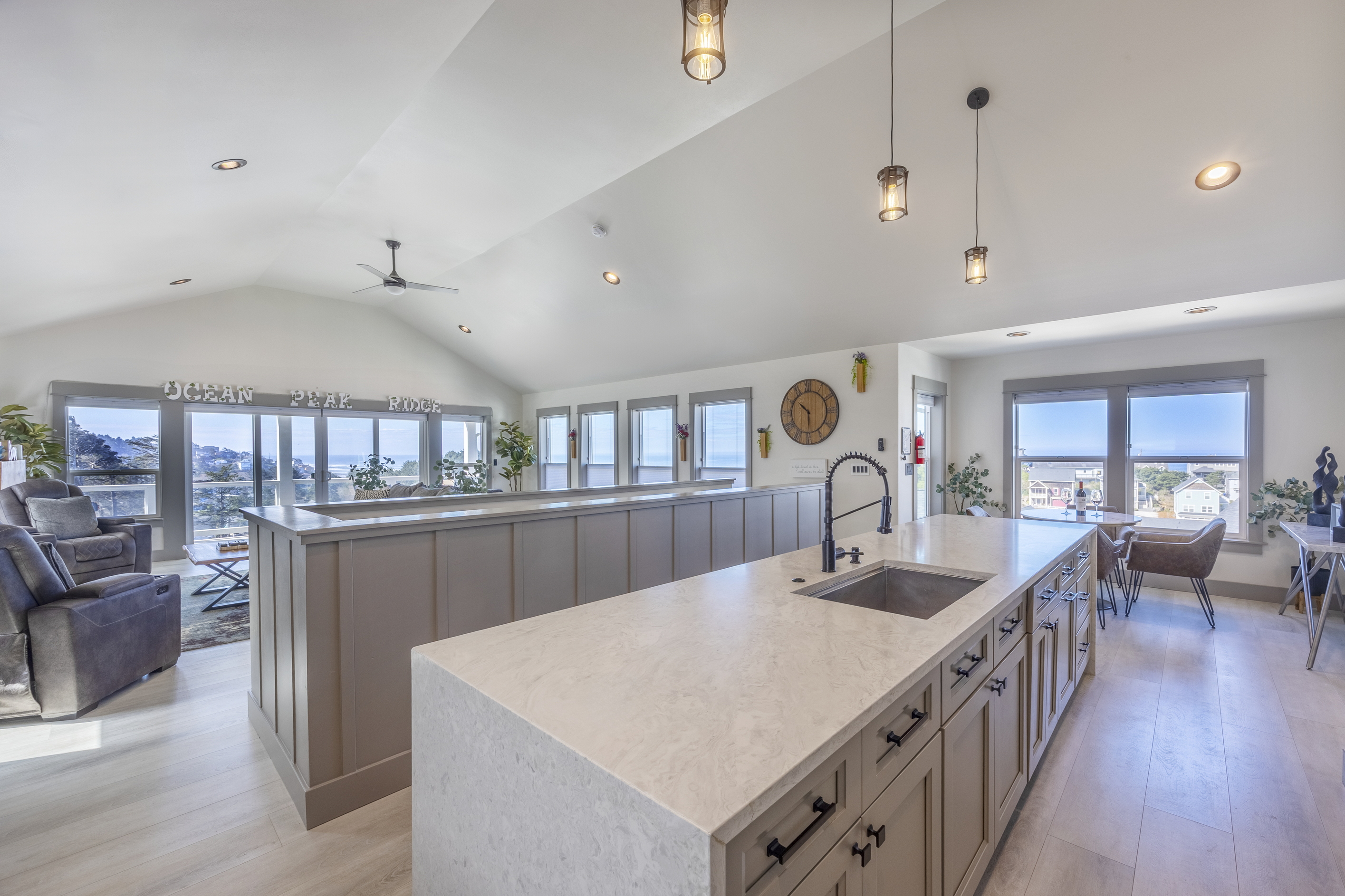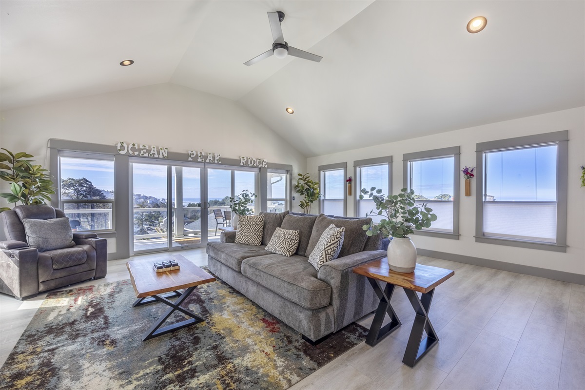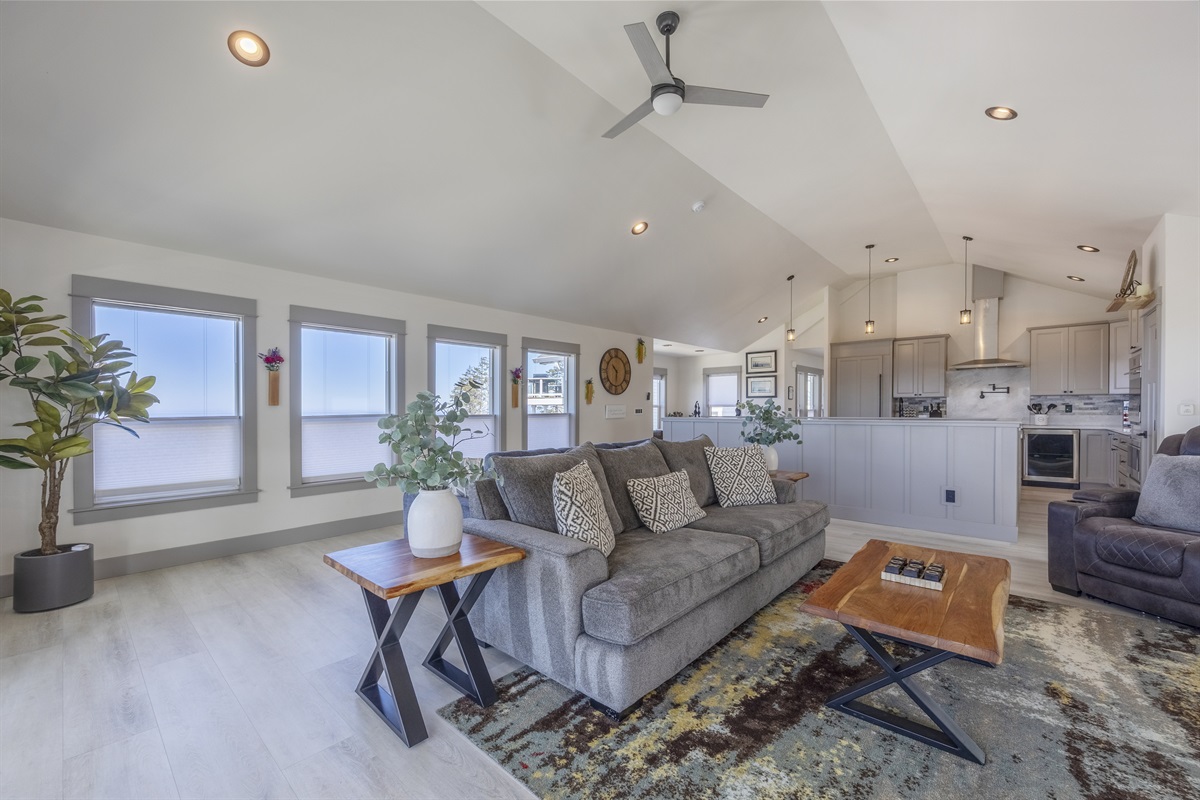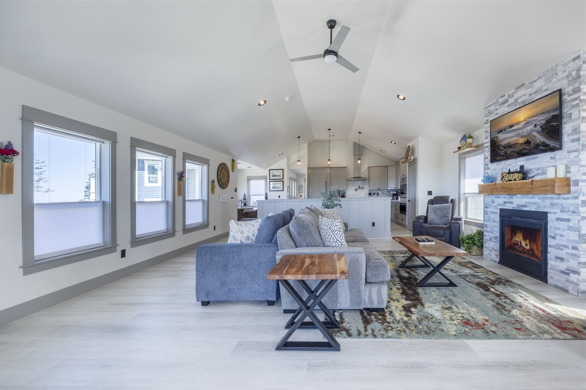You enter into an open living, kitchen, and dining area featuring a large Smart TV, a deck with amazing ocean views, and plenty of space for everyone to dine, making it the perfect gathering spot for family and friends enjoying their Lincoln City beach vacation.