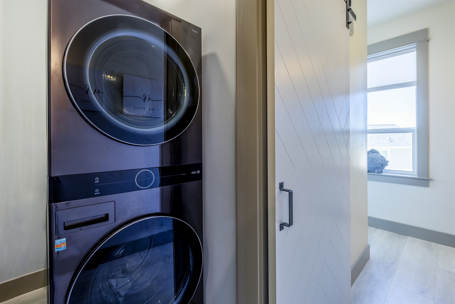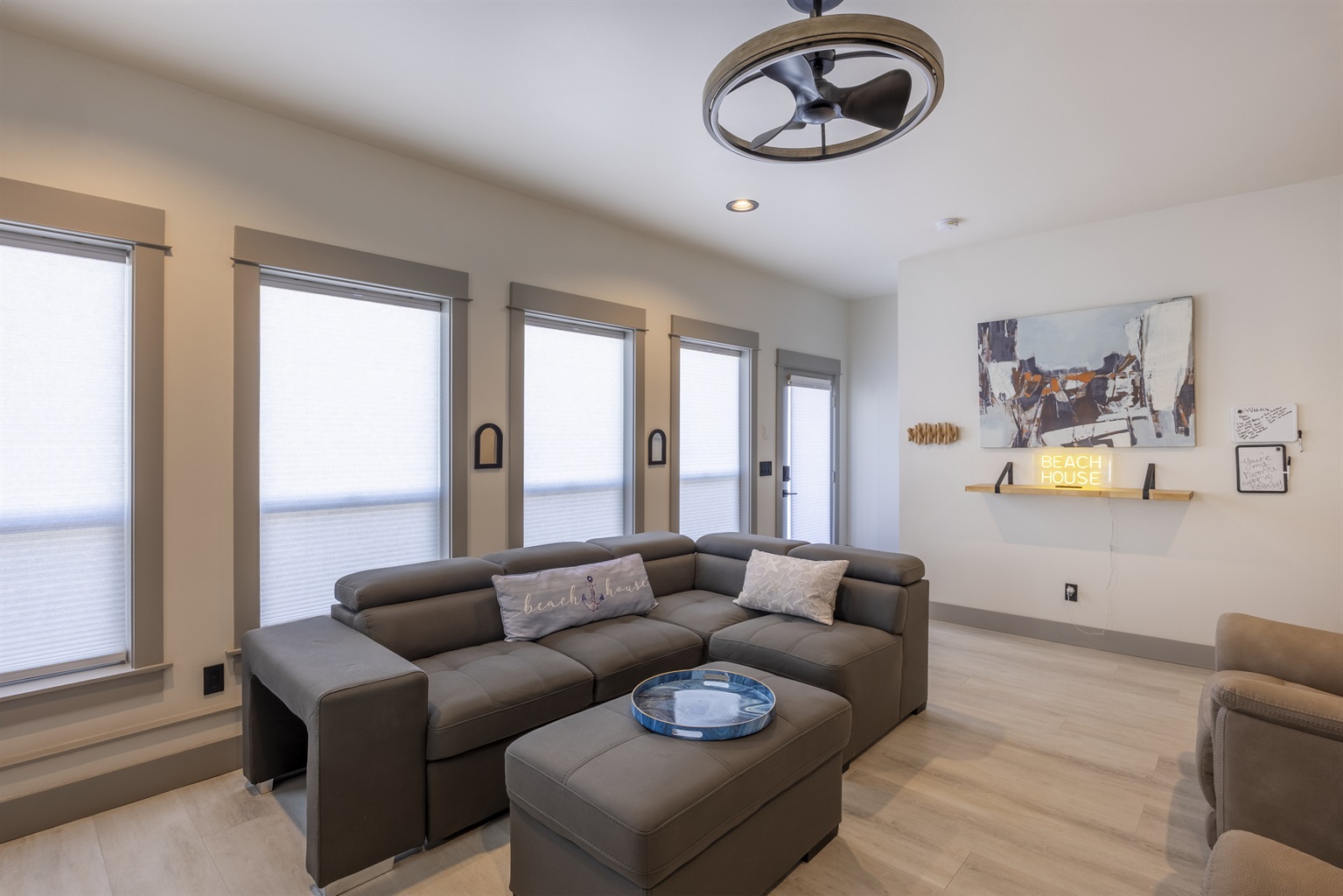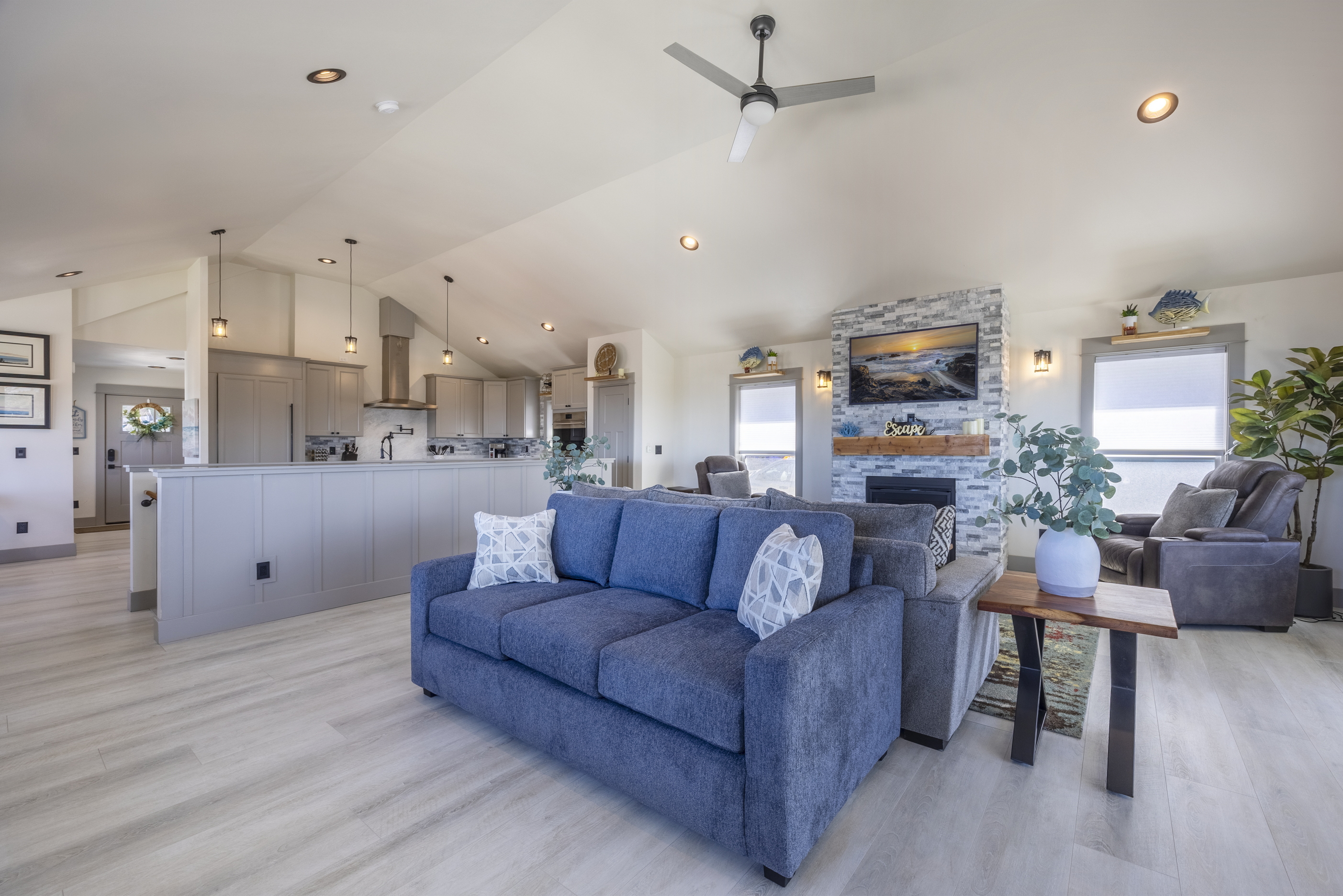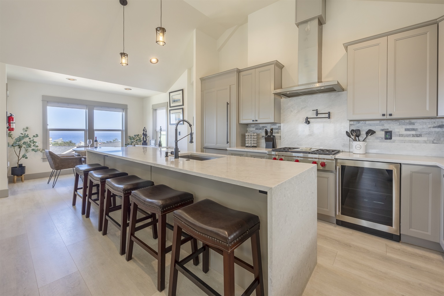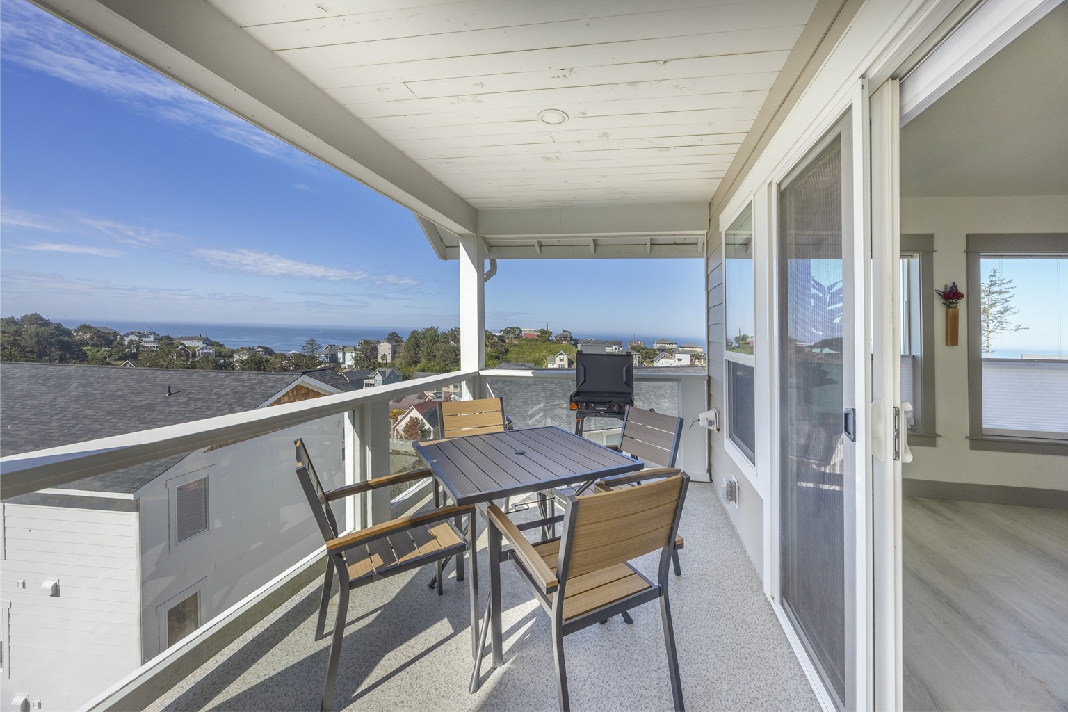 You enter into an open living, kitchen, and dining area featuring a large Smart TV, a deck with amazing ocean views, and plenty of space for everyone to dine, making it the perfect gathering spot for family and friends enjoying their Lincoln City beach vacation.